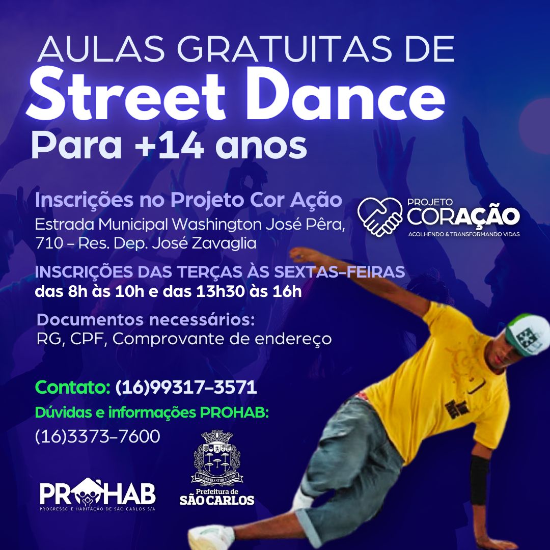 As aulas de Street Dance acontecerão no Projeto Cor Ação, também aos sábados, com duração de 6 meses. São 40 vagas disponíveis para maiores de 14 anos.