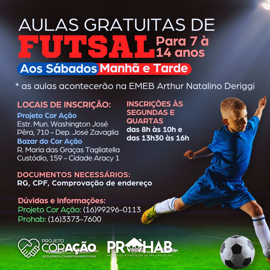 As aulas de Futsal acontecerão na EMEB Arthur Natalino Deriggi, aos sábados, nos períodos da manhã e da tarde, com duração total de 6 meses. São 60 vagas abertas para serem aproveitadas por crianças de 7 à 14 anos.