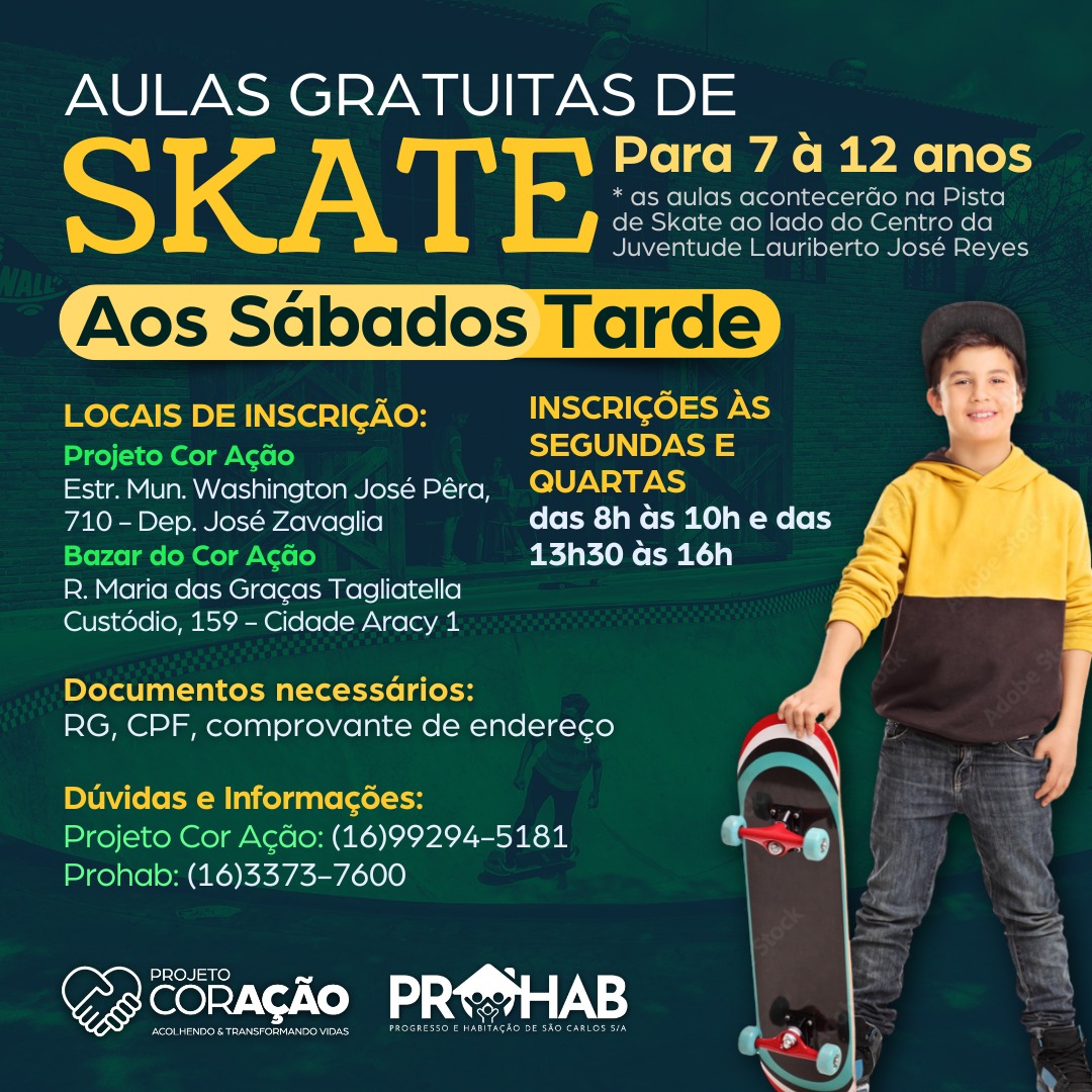A Prohab, em parceria com o Projeto Cor Ação, irá oferecer aulas de futsal e skate para crianças de São Carlos totalmente gratuitas!